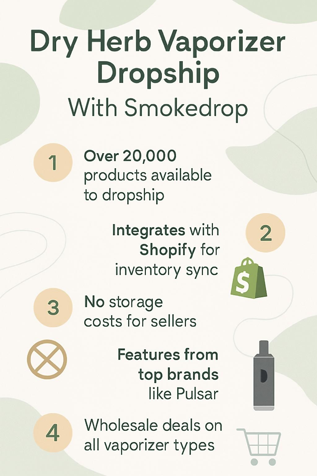 - Offer bundle deals on vaporizers and accessories through SmokeDrop’s fulfillment system, which speeds up shipping and builds customer loyalty in the competitive dropshipping space.